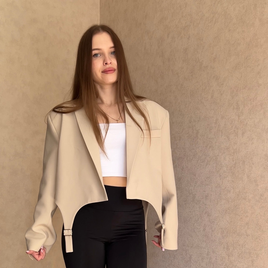 Лаконічний укорочений піджак із сучасним силуетом - акцентний елемент гардероба, який легко вписується як у повсякденні, так і в більш зібрані образи. Продуманий крій створює чітку форму, підкреслюючи лінію плечей і додаючи образу структури.